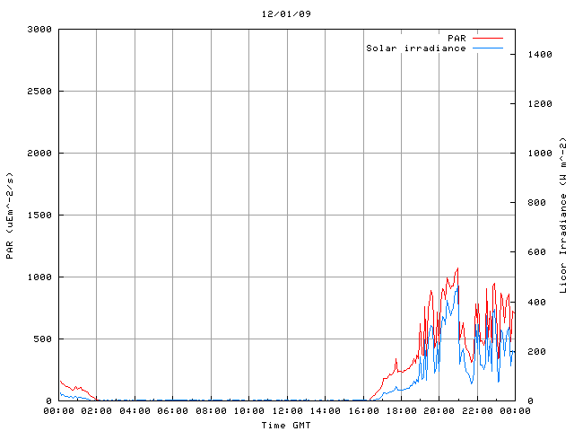The PML meteorological station, situated on the south-west corner of the building roof, consists of a Hygroclip S3 temperature and humidity sensor housed in a radiation shield, a Mierij Meteo solid state wind sensor (MMW-005), a Chelsea instruments half-hemisphere PAR sensor, a Li-Cor pyranometer (LI-200SZ) and an Omni Instruments 6" tipping bucket raingauge (RG200). The data are logged every 5 minutes using a Pace Scientific XR5 data logger. The real-time rainfall data is likely in error - the correct values will be displayed after a time lag of approximately 24 hours. The meteorological station is sheltered from winds in the north-east and underestimates winds from this quarter. To use these data please contact Dr Tim Smyth.