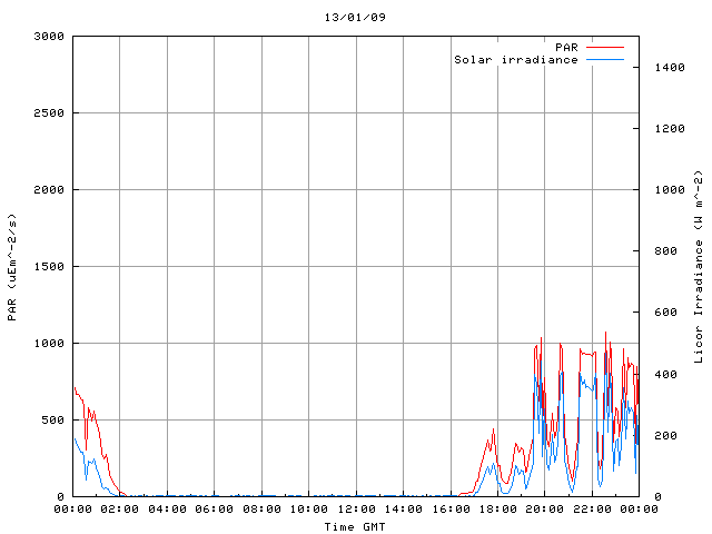 The PML meteorological station, situated on the south-west corner of the building roof, consists of a Hygroclip S3 temperature and humidity sensor housed in a radiation shield, a Mierij Meteo solid state wind sensor (MMW-005), a Chelsea instruments half-hemisphere PAR sensor, a Li-Cor pyranometer (LI-200SZ) and an Omni Instruments 6" tipping bucket raingauge (RG200). The data are logged every 5 minutes using a Pace Scientific XR5 data logger. The real-time rainfall data is likely in error - the correct values will be displayed after a time lag of approximately 24 hours. The meteorological station is sheltered from winds in the north-east and underestimates winds from this quarter. To use these data please contact Dr Tim Smyth.