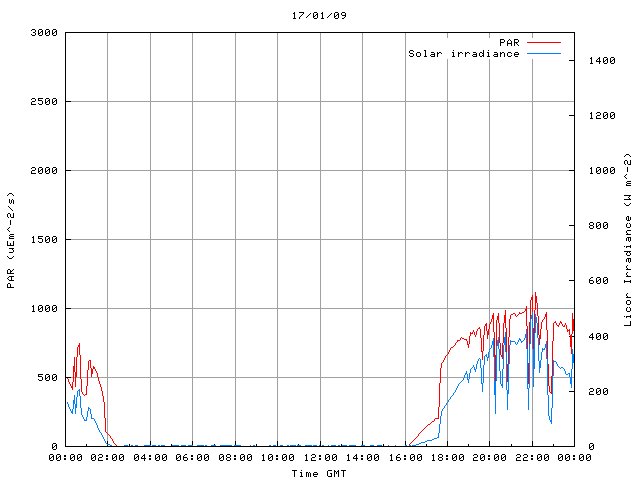 The PML meteorological station, situated on the south-west corner of the building roof, consists of a Hygroclip S3 temperature and humidity sensor housed in a radiation shield, a Mierij Meteo solid state wind sensor (MMW-005), a Chelsea instruments half-hemisphere PAR sensor, a Li-Cor pyranometer (LI-200SZ) and an Omni Instruments 6" tipping bucket raingauge (RG200). The data are logged every 5 minutes using a Pace Scientific XR5 data logger. The real-time rainfall data is likely in error - the correct values will be displayed after a time lag of approximately 24 hours. The meteorological station is sheltered from winds in the north-east and underestimates winds from this quarter. To use these data please contact Dr Tim Smyth.