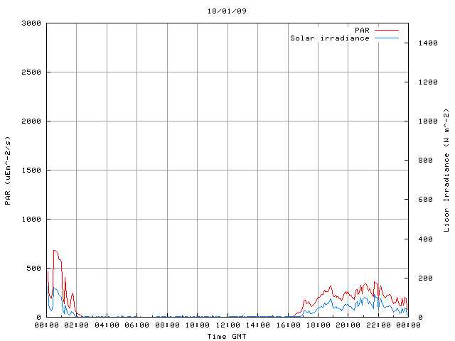 The PML meteorological station, situated on the south-west corner of the building roof, consists of a Hygroclip S3 temperature and humidity sensor housed in a radiation shield, a Mierij Meteo solid state wind sensor (MMW-005), a Chelsea instruments half-hemisphere PAR sensor, a Li-Cor pyranometer (LI-200SZ) and an Omni Instruments 6" tipping bucket raingauge (RG200). The data are logged every 5 minutes using a Pace Scientific XR5 data logger. The real-time rainfall data is likely in error - the correct values will be displayed after a time lag of approximately 24 hours. The meteorological station is sheltered from winds in the north-east and underestimates winds from this quarter. To use these data please contact Dr Tim Smyth.