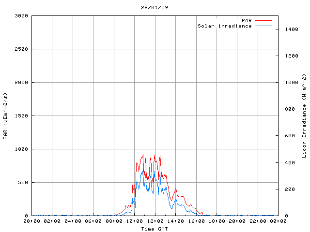 The PML meteorological station, situated on the south-west corner of the building roof, consists of a Hygroclip S3 temperature and humidity sensor housed in a radiation shield, a Mierij Meteo solid state wind sensor (MMW-005), a Chelsea instruments half-hemisphere PAR sensor, a Li-Cor pyranometer (LI-200SZ) and an Omni Instruments 6" tipping bucket raingauge (RG200). The data are logged every 5 minutes using a Pace Scientific XR5 data logger. The real-time rainfall data is likely in error - the correct values will be displayed after a time lag of approximately 24 hours. The meteorological station is sheltered from winds in the north-east and underestimates winds from this quarter. To use these data please contact Dr Tim Smyth.
