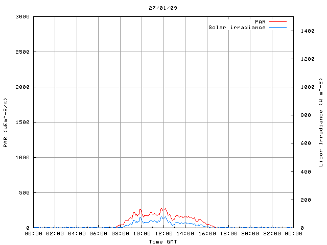 The PML meteorological station, situated on the south-west corner of the building roof, consists of a Hygroclip S3 temperature and humidity sensor housed in a radiation shield, a Mierij Meteo solid state wind sensor (MMW-005), a Chelsea instruments half-hemisphere PAR sensor, a Li-Cor pyranometer (LI-200SZ) and an Omni Instruments 6" tipping bucket raingauge (RG200). The data are logged every 5 minutes using a Pace Scientific XR5 data logger. The real-time rainfall data is likely in error - the correct values will be displayed after a time lag of approximately 24 hours. The meteorological station is sheltered from winds in the north-east and underestimates winds from this quarter. To use these data please contact Dr Tim Smyth.