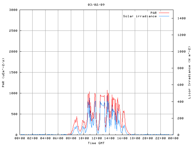The PML meteorological station, situated on the south-west corner of the building roof, consists of a Hygroclip S3 temperature and humidity sensor housed in a radiation shield, a Mierij Meteo solid state wind sensor (MMW-005), a Chelsea instruments half-hemisphere PAR sensor, a Li-Cor pyranometer (LI-200SZ) and an Omni Instruments 6" tipping bucket raingauge (RG200). The data are logged every 5 minutes using a Pace Scientific XR5 data logger. The real-time rainfall data is likely in error - the correct values will be displayed after a time lag of approximately 24 hours. The meteorological station is sheltered from winds in the north-east and underestimates winds from this quarter. To use these data please contact Dr Tim Smyth.
