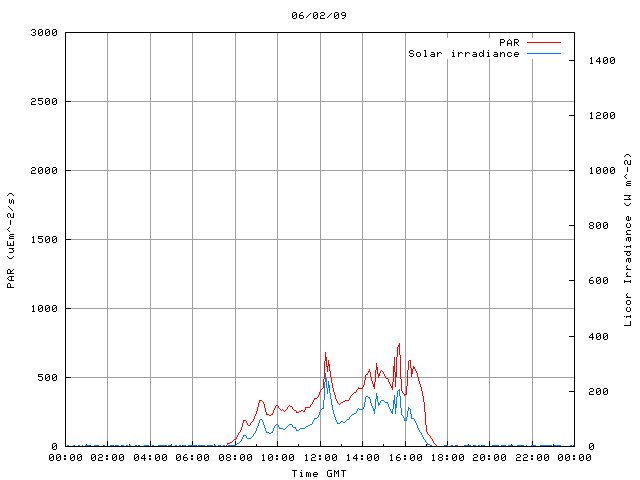 The PML meteorological station, situated on the south-west corner of the building roof, consists of a Hygroclip S3 temperature and humidity sensor housed in a radiation shield, a Mierij Meteo solid state wind sensor (MMW-005), a Chelsea instruments half-hemisphere PAR sensor, a Li-Cor pyranometer (LI-200SZ) and an Omni Instruments 6" tipping bucket raingauge (RG200). The data are logged every 5 minutes using a Pace Scientific XR5 data logger. The real-time rainfall data is likely in error - the correct values will be displayed after a time lag of approximately 24 hours. The meteorological station is sheltered from winds in the north-east and underestimates winds from this quarter. To use these data please contact Dr Tim Smyth.