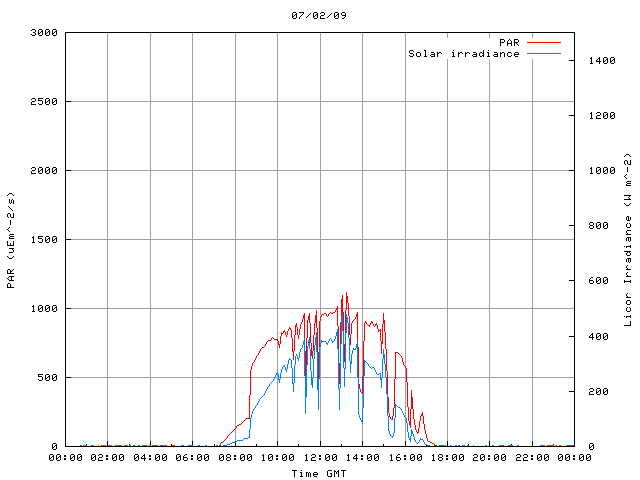 The PML meteorological station, situated on the south-west corner of the building roof, consists of a Hygroclip S3 temperature and humidity sensor housed in a radiation shield, a Mierij Meteo solid state wind sensor (MMW-005), a Chelsea instruments half-hemisphere PAR sensor, a Li-Cor pyranometer (LI-200SZ) and an Omni Instruments 6" tipping bucket raingauge (RG200). The data are logged every 5 minutes using a Pace Scientific XR5 data logger. The real-time rainfall data is likely in error - the correct values will be displayed after a time lag of approximately 24 hours. The meteorological station is sheltered from winds in the north-east and underestimates winds from this quarter. To use these data please contact Dr Tim Smyth.