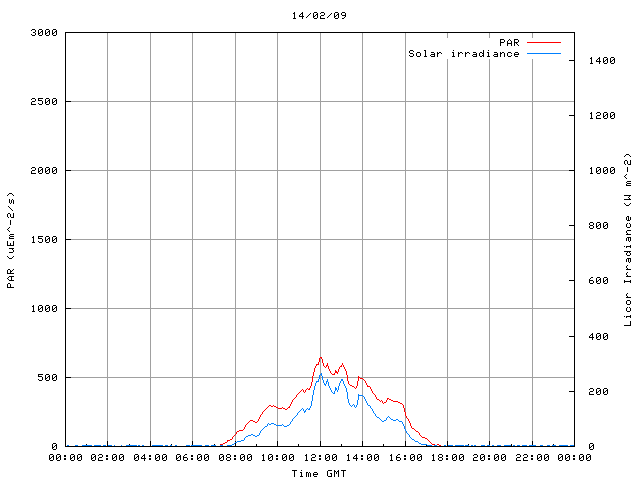 The PML meteorological station, situated on the south-west corner of the building roof, consists of a Hygroclip S3 temperature and humidity sensor housed in a radiation shield, a Mierij Meteo solid state wind sensor (MMW-005), a Chelsea instruments half-hemisphere PAR sensor, a Li-Cor pyranometer (LI-200SZ) and an Omni Instruments 6" tipping bucket raingauge (RG200). The data are logged every 5 minutes using a Pace Scientific XR5 data logger. The real-time rainfall data is likely in error - the correct values will be displayed after a time lag of approximately 24 hours. The meteorological station is sheltered from winds in the north-east and underestimates winds from this quarter. To use these data please contact Dr Tim Smyth.