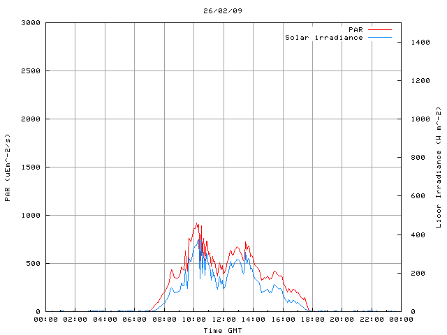 The PML meteorological station, situated on the south-west corner of the building roof, consists of a Hygroclip S3 temperature and humidity sensor housed in a radiation shield, a Mierij Meteo solid state wind sensor (MMW-005), a Chelsea instruments half-hemisphere PAR sensor, a Li-Cor pyranometer (LI-200SZ) and an Omni Instruments 6" tipping bucket raingauge (RG200). The data are logged every 5 minutes using a Pace Scientific XR5 data logger. The real-time rainfall data is likely in error - the correct values will be displayed after a time lag of approximately 24 hours. The meteorological station is sheltered from winds in the north-east and underestimates winds from this quarter. To use these data please contact Dr Tim Smyth.