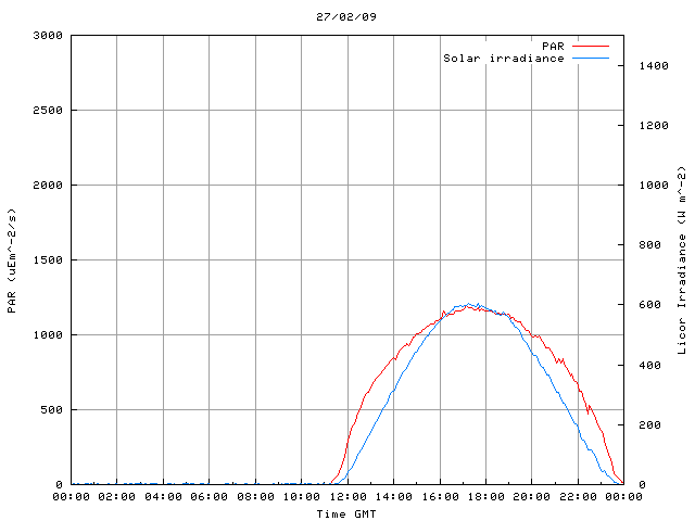 The PML meteorological station, situated on the south-west corner of the building roof, consists of a Hygroclip S3 temperature and humidity sensor housed in a radiation shield, a Mierij Meteo solid state wind sensor (MMW-005), a Chelsea instruments half-hemisphere PAR sensor, a Li-Cor pyranometer (LI-200SZ) and an Omni Instruments 6" tipping bucket raingauge (RG200). The data are logged every 5 minutes using a Pace Scientific XR5 data logger. The real-time rainfall data is likely in error - the correct values will be displayed after a time lag of approximately 24 hours. The meteorological station is sheltered from winds in the north-east and underestimates winds from this quarter. To use these data please contact Dr Tim Smyth.