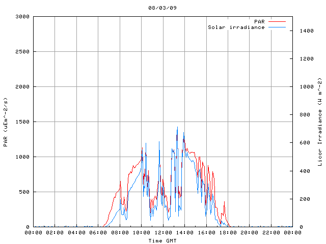 The PML meteorological station, situated on the south-west corner of the building roof, consists of a Hygroclip S3 temperature and humidity sensor housed in a radiation shield, a Mierij Meteo solid state wind sensor (MMW-005), a Chelsea instruments half-hemisphere PAR sensor, a Li-Cor pyranometer (LI-200SZ) and an Omni Instruments 6" tipping bucket raingauge (RG200). The data are logged every 5 minutes using a Pace Scientific XR5 data logger. The real-time rainfall data is likely in error - the correct values will be displayed after a time lag of approximately 24 hours. The meteorological station is sheltered from winds in the north-east and underestimates winds from this quarter. To use these data please contact Dr Tim Smyth.