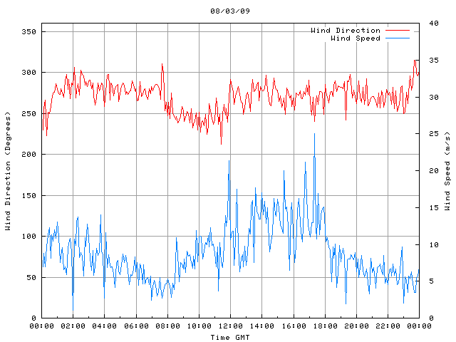 - Max Wind Speed: 25.0 ms-1 Time: 17:19:21 GMT