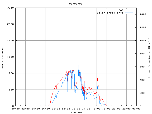 The PML meteorological station, situated on the south-west corner of the building roof, consists of a Hygroclip S3 temperature and humidity sensor housed in a radiation shield, a Mierij Meteo solid state wind sensor (MMW-005), a Chelsea instruments half-hemisphere PAR sensor, a Li-Cor pyranometer (LI-200SZ) and an Omni Instruments 6" tipping bucket raingauge (RG200). The data are logged every 5 minutes using a Pace Scientific XR5 data logger. The real-time rainfall data is likely in error - the correct values will be displayed after a time lag of approximately 24 hours. The meteorological station is sheltered from winds in the north-east and underestimates winds from this quarter. To use these data please contact Dr Tim Smyth.