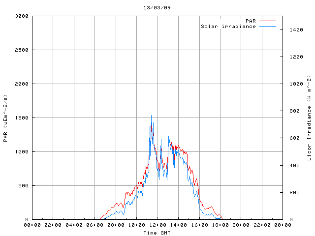 The PML meteorological station, situated on the south-west corner of the building roof, consists of a Hygroclip S3 temperature and humidity sensor housed in a radiation shield, a Mierij Meteo solid state wind sensor (MMW-005), a Chelsea instruments half-hemisphere PAR sensor, a Li-Cor pyranometer (LI-200SZ) and an Omni Instruments 6" tipping bucket raingauge (RG200). The data are logged every 5 minutes using a Pace Scientific XR5 data logger. The real-time rainfall data is likely in error - the correct values will be displayed after a time lag of approximately 24 hours. The meteorological station is sheltered from winds in the north-east and underestimates winds from this quarter. To use these data please contact Dr Tim Smyth.