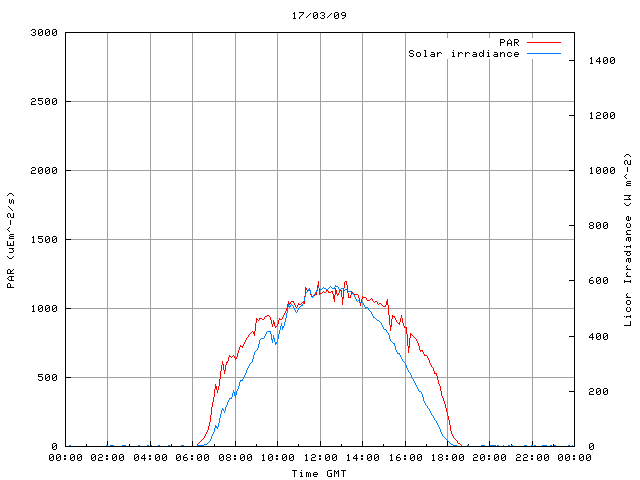 The PML meteorological station, situated on the south-west corner of the building roof, consists of a Hygroclip S3 temperature and humidity sensor housed in a radiation shield, a Mierij Meteo solid state wind sensor (MMW-005), a Chelsea instruments half-hemisphere PAR sensor, a Li-Cor pyranometer (LI-200SZ) and an Omni Instruments 6" tipping bucket raingauge (RG200). The data are logged every 5 minutes using a Pace Scientific XR5 data logger. The real-time rainfall data is likely in error - the correct values will be displayed after a time lag of approximately 24 hours. The meteorological station is sheltered from winds in the north-east and underestimates winds from this quarter. To use these data please contact Dr Tim Smyth.