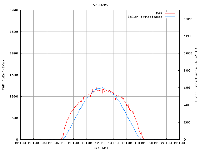The PML meteorological station, situated on the south-west corner of the building roof, consists of a Hygroclip S3 temperature and humidity sensor housed in a radiation shield, a Mierij Meteo solid state wind sensor (MMW-005), a Chelsea instruments half-hemisphere PAR sensor, a Li-Cor pyranometer (LI-200SZ) and an Omni Instruments 6" tipping bucket raingauge (RG200). The data are logged every 5 minutes using a Pace Scientific XR5 data logger. The real-time rainfall data is likely in error - the correct values will be displayed after a time lag of approximately 24 hours. The meteorological station is sheltered from winds in the north-east and underestimates winds from this quarter. To use these data please contact Dr Tim Smyth.