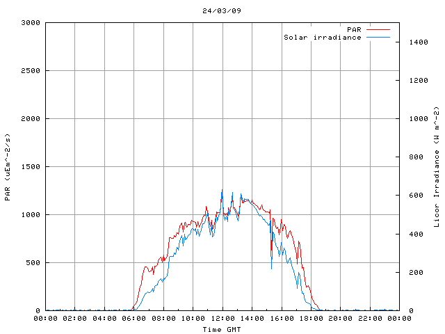 The PML meteorological station, situated on the south-west corner of the building roof, consists of a Hygroclip S3 temperature and humidity sensor housed in a radiation shield, a Mierij Meteo solid state wind sensor (MMW-005), a Chelsea instruments half-hemisphere PAR sensor, a Li-Cor pyranometer (LI-200SZ) and an Omni Instruments 6" tipping bucket raingauge (RG200). The data are logged every 5 minutes using a Pace Scientific XR5 data logger. The real-time rainfall data is likely in error - the correct values will be displayed after a time lag of approximately 24 hours. The meteorological station is sheltered from winds in the north-east and underestimates winds from this quarter. To use these data please contact Dr Tim Smyth.