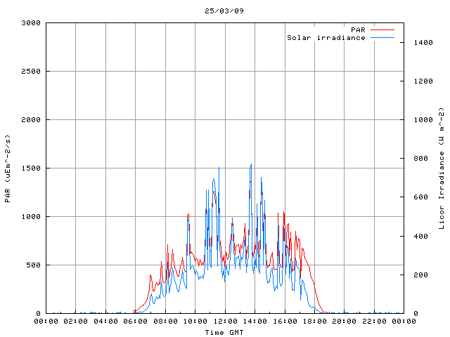The PML meteorological station, situated on the south-west corner of the building roof, consists of a Hygroclip S3 temperature and humidity sensor housed in a radiation shield, a Mierij Meteo solid state wind sensor (MMW-005), a Chelsea instruments half-hemisphere PAR sensor, a Li-Cor pyranometer (LI-200SZ) and an Omni Instruments 6" tipping bucket raingauge (RG200). The data are logged every 5 minutes using a Pace Scientific XR5 data logger. The real-time rainfall data is likely in error - the correct values will be displayed after a time lag of approximately 24 hours. The meteorological station is sheltered from winds in the north-east and underestimates winds from this quarter. To use these data please contact Dr Tim Smyth.