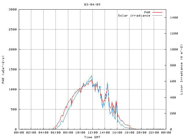 The PML meteorological station, situated on the south-west corner of the building roof, consists of a Hygroclip S3 temperature and humidity sensor housed in a radiation shield, a Mierij Meteo solid state wind sensor (MMW-005), a Chelsea instruments half-hemisphere PAR sensor, a Li-Cor pyranometer (LI-200SZ) and an Omni Instruments 6" tipping bucket raingauge (RG200). The data are logged every 5 minutes using a Pace Scientific XR5 data logger. The real-time rainfall data is likely in error - the correct values will be displayed after a time lag of approximately 24 hours. The meteorological station is sheltered from winds in the north-east and underestimates winds from this quarter. To use these data please contact Dr Tim Smyth.