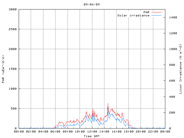 The PML meteorological station, situated on the south-west corner of the building roof, consists of a Hygroclip S3 temperature and humidity sensor housed in a radiation shield, a Mierij Meteo solid state wind sensor (MMW-005), a Chelsea instruments half-hemisphere PAR sensor, a Li-Cor pyranometer (LI-200SZ) and an Omni Instruments 6" tipping bucket raingauge (RG200). The data are logged every 5 minutes using a Pace Scientific XR5 data logger. The real-time rainfall data is likely in error - the correct values will be displayed after a time lag of approximately 24 hours. The meteorological station is sheltered from winds in the north-east and underestimates winds from this quarter. To use these data please contact Dr Tim Smyth.
