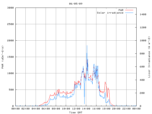 The PML meteorological station, situated on the south-west corner of the building roof, consists of a Hygroclip S3 temperature and humidity sensor housed in a radiation shield, a Mierij Meteo solid state wind sensor (MMW-005), a Chelsea instruments half-hemisphere PAR sensor, a Li-Cor pyranometer (LI-200SZ) and an Omni Instruments 6" tipping bucket raingauge (RG200). The data are logged every 5 minutes using a Pace Scientific XR5 data logger. The real-time rainfall data is likely in error - the correct values will be displayed after a time lag of approximately 24 hours. The meteorological station is sheltered from winds in the north-east and underestimates winds from this quarter. To use these data please contact Dr Tim Smyth.