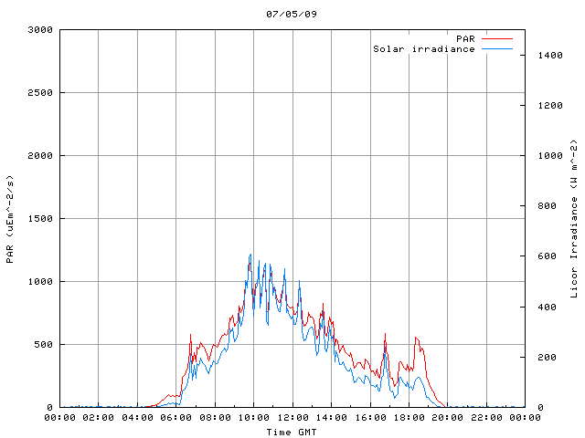 The PML meteorological station, situated on the south-west corner of the building roof, consists of a Hygroclip S3 temperature and humidity sensor housed in a radiation shield, a Mierij Meteo solid state wind sensor (MMW-005), a Chelsea instruments half-hemisphere PAR sensor, a Li-Cor pyranometer (LI-200SZ) and an Omni Instruments 6" tipping bucket raingauge (RG200). The data are logged every 5 minutes using a Pace Scientific XR5 data logger. The real-time rainfall data is likely in error - the correct values will be displayed after a time lag of approximately 24 hours. The meteorological station is sheltered from winds in the north-east and underestimates winds from this quarter. To use these data please contact Dr Tim Smyth.