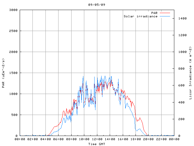The PML meteorological station, situated on the south-west corner of the building roof, consists of a Hygroclip S3 temperature and humidity sensor housed in a radiation shield, a Mierij Meteo solid state wind sensor (MMW-005), a Chelsea instruments half-hemisphere PAR sensor, a Li-Cor pyranometer (LI-200SZ) and an Omni Instruments 6" tipping bucket raingauge (RG200). The data are logged every 5 minutes using a Pace Scientific XR5 data logger. The real-time rainfall data is likely in error - the correct values will be displayed after a time lag of approximately 24 hours. The meteorological station is sheltered from winds in the north-east and underestimates winds from this quarter. To use these data please contact Dr Tim Smyth.