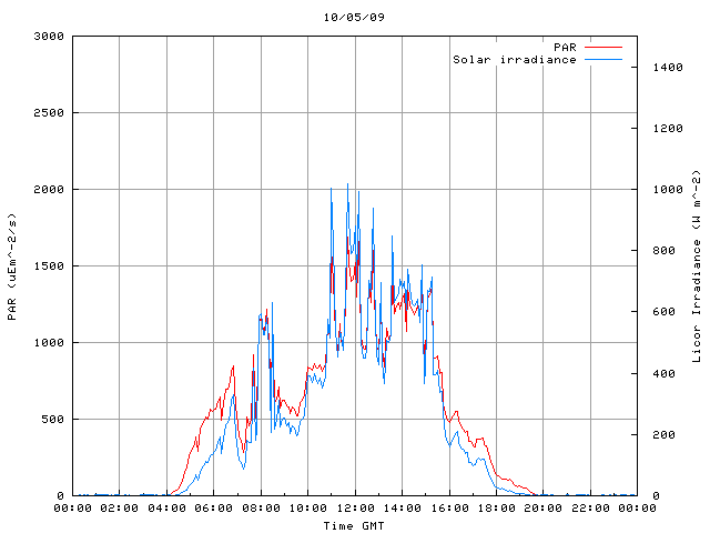 The PML meteorological station, situated on the south-west corner of the building roof, consists of a Hygroclip S3 temperature and humidity sensor housed in a radiation shield, a Mierij Meteo solid state wind sensor (MMW-005), a Chelsea instruments half-hemisphere PAR sensor, a Li-Cor pyranometer (LI-200SZ) and an Omni Instruments 6" tipping bucket raingauge (RG200). The data are logged every 5 minutes using a Pace Scientific XR5 data logger. The real-time rainfall data is likely in error - the correct values will be displayed after a time lag of approximately 24 hours. The meteorological station is sheltered from winds in the north-east and underestimates winds from this quarter. To use these data please contact Dr Tim Smyth.