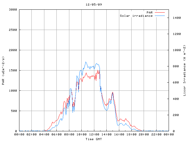 The PML meteorological station, situated on the south-west corner of the building roof, consists of a Hygroclip S3 temperature and humidity sensor housed in a radiation shield, a Mierij Meteo solid state wind sensor (MMW-005), a Chelsea instruments half-hemisphere PAR sensor, a Li-Cor pyranometer (LI-200SZ) and an Omni Instruments 6" tipping bucket raingauge (RG200). The data are logged every 5 minutes using a Pace Scientific XR5 data logger. The real-time rainfall data is likely in error - the correct values will be displayed after a time lag of approximately 24 hours. The meteorological station is sheltered from winds in the north-east and underestimates winds from this quarter. To use these data please contact Dr Tim Smyth.