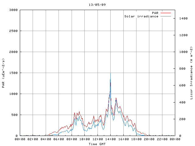 The PML meteorological station, situated on the south-west corner of the building roof, consists of a Hygroclip S3 temperature and humidity sensor housed in a radiation shield, a Mierij Meteo solid state wind sensor (MMW-005), a Chelsea instruments half-hemisphere PAR sensor, a Li-Cor pyranometer (LI-200SZ) and an Omni Instruments 6" tipping bucket raingauge (RG200). The data are logged every 5 minutes using a Pace Scientific XR5 data logger. The real-time rainfall data is likely in error - the correct values will be displayed after a time lag of approximately 24 hours. The meteorological station is sheltered from winds in the north-east and underestimates winds from this quarter. To use these data please contact Dr Tim Smyth.