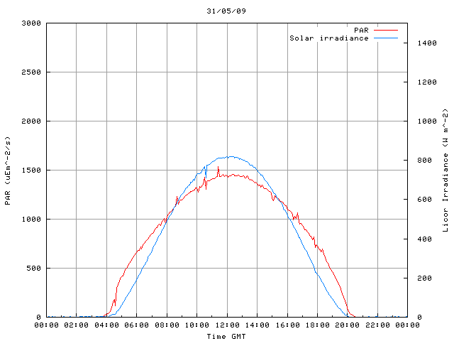 The PML meteorological station, situated on the south-west corner of the building roof, consists of a Hygroclip S3 temperature and humidity sensor housed in a radiation shield, a Mierij Meteo solid state wind sensor (MMW-005), a Chelsea instruments half-hemisphere PAR sensor, a Li-Cor pyranometer (LI-200SZ) and an Omni Instruments 6" tipping bucket raingauge (RG200). The data are logged every 5 minutes using a Pace Scientific XR5 data logger. The real-time rainfall data is likely in error - the correct values will be displayed after a time lag of approximately 24 hours. The meteorological station is sheltered from winds in the north-east and underestimates winds from this quarter. To use these data please contact Dr Tim Smyth.