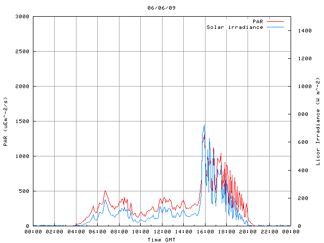 The PML meteorological station, situated on the south-west corner of the building roof, consists of a Hygroclip S3 temperature and humidity sensor housed in a radiation shield, a Mierij Meteo solid state wind sensor (MMW-005), a Chelsea instruments half-hemisphere PAR sensor, a Li-Cor pyranometer (LI-200SZ) and an Omni Instruments 6" tipping bucket raingauge (RG200). The data are logged every 5 minutes using a Pace Scientific XR5 data logger. The real-time rainfall data is likely in error - the correct values will be displayed after a time lag of approximately 24 hours. The meteorological station is sheltered from winds in the north-east and underestimates winds from this quarter. To use these data please contact Dr Tim Smyth.