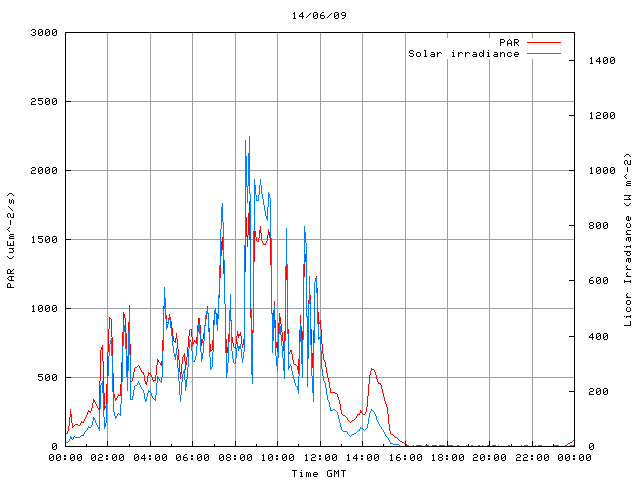 The PML meteorological station, situated on the south-west corner of the building roof, consists of a Hygroclip S3 temperature and humidity sensor housed in a radiation shield, a Mierij Meteo solid state wind sensor (MMW-005), a Chelsea instruments half-hemisphere PAR sensor, a Li-Cor pyranometer (LI-200SZ) and an Omni Instruments 6" tipping bucket raingauge (RG200). The data are logged every 5 minutes using a Pace Scientific XR5 data logger. The real-time rainfall data is likely in error - the correct values will be displayed after a time lag of approximately 24 hours. The meteorological station is sheltered from winds in the north-east and underestimates winds from this quarter. To use these data please contact Dr Tim Smyth.