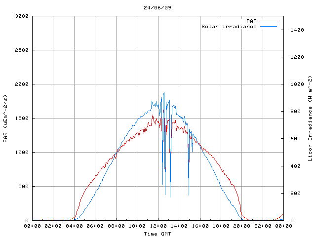 The PML meteorological station, situated on the south-west corner of the building roof, consists of a Hygroclip S3 temperature and humidity sensor housed in a radiation shield, a Mierij Meteo solid state wind sensor (MMW-005), a Chelsea instruments half-hemisphere PAR sensor, a Li-Cor pyranometer (LI-200SZ) and an Omni Instruments 6" tipping bucket raingauge (RG200). The data are logged every 5 minutes using a Pace Scientific XR5 data logger. The real-time rainfall data is likely in error - the correct values will be displayed after a time lag of approximately 24 hours. The meteorological station is sheltered from winds in the north-east and underestimates winds from this quarter. To use these data please contact Dr Tim Smyth.