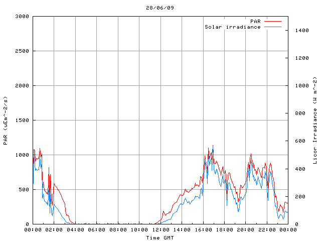 The PML meteorological station, situated on the south-west corner of the building roof, consists of a Hygroclip S3 temperature and humidity sensor housed in a radiation shield, a Mierij Meteo solid state wind sensor (MMW-005), a Chelsea instruments half-hemisphere PAR sensor, a Li-Cor pyranometer (LI-200SZ) and an Omni Instruments 6" tipping bucket raingauge (RG200). The data are logged every 5 minutes using a Pace Scientific XR5 data logger. The real-time rainfall data is likely in error - the correct values will be displayed after a time lag of approximately 24 hours. The meteorological station is sheltered from winds in the north-east and underestimates winds from this quarter. To use these data please contact Dr Tim Smyth.