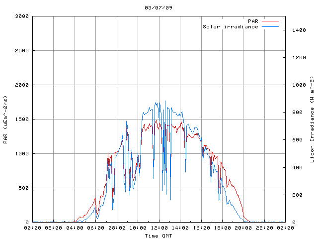 The PML meteorological station, situated on the south-west corner of the building roof, consists of a Hygroclip S3 temperature and humidity sensor housed in a radiation shield, a Mierij Meteo solid state wind sensor (MMW-005), a Chelsea instruments half-hemisphere PAR sensor, a Li-Cor pyranometer (LI-200SZ) and an Omni Instruments 6" tipping bucket raingauge (RG200). The data are logged every 5 minutes using a Pace Scientific XR5 data logger. The real-time rainfall data is likely in error - the correct values will be displayed after a time lag of approximately 24 hours. The meteorological station is sheltered from winds in the north-east and underestimates winds from this quarter. To use these data please contact Dr Tim Smyth.
