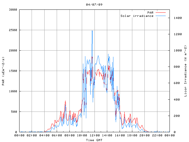 The PML meteorological station, situated on the south-west corner of the building roof, consists of a Hygroclip S3 temperature and humidity sensor housed in a radiation shield, a Mierij Meteo solid state wind sensor (MMW-005), a Chelsea instruments half-hemisphere PAR sensor, a Li-Cor pyranometer (LI-200SZ) and an Omni Instruments 6" tipping bucket raingauge (RG200). The data are logged every 5 minutes using a Pace Scientific XR5 data logger. The real-time rainfall data is likely in error - the correct values will be displayed after a time lag of approximately 24 hours. The meteorological station is sheltered from winds in the north-east and underestimates winds from this quarter. To use these data please contact Dr Tim Smyth.