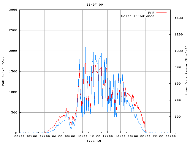The PML meteorological station, situated on the south-west corner of the building roof, consists of a Hygroclip S3 temperature and humidity sensor housed in a radiation shield, a Mierij Meteo solid state wind sensor (MMW-005), a Chelsea instruments half-hemisphere PAR sensor, a Li-Cor pyranometer (LI-200SZ) and an Omni Instruments 6" tipping bucket raingauge (RG200). The data are logged every 5 minutes using a Pace Scientific XR5 data logger. The real-time rainfall data is likely in error - the correct values will be displayed after a time lag of approximately 24 hours. The meteorological station is sheltered from winds in the north-east and underestimates winds from this quarter. To use these data please contact Dr Tim Smyth.