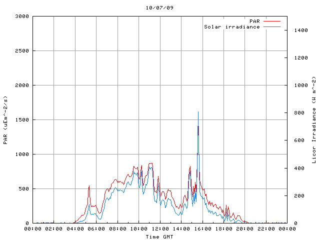 The PML meteorological station, situated on the south-west corner of the building roof, consists of a Hygroclip S3 temperature and humidity sensor housed in a radiation shield, a Mierij Meteo solid state wind sensor (MMW-005), a Chelsea instruments half-hemisphere PAR sensor, a Li-Cor pyranometer (LI-200SZ) and an Omni Instruments 6" tipping bucket raingauge (RG200). The data are logged every 5 minutes using a Pace Scientific XR5 data logger. The real-time rainfall data is likely in error - the correct values will be displayed after a time lag of approximately 24 hours. The meteorological station is sheltered from winds in the north-east and underestimates winds from this quarter. To use these data please contact Dr Tim Smyth.
