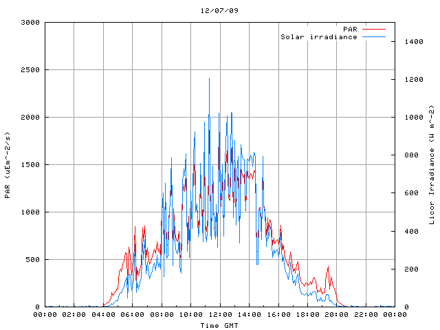 The PML meteorological station, situated on the south-west corner of the building roof, consists of a Hygroclip S3 temperature and humidity sensor housed in a radiation shield, a Mierij Meteo solid state wind sensor (MMW-005), a Chelsea instruments half-hemisphere PAR sensor, a Li-Cor pyranometer (LI-200SZ) and an Omni Instruments 6" tipping bucket raingauge (RG200). The data are logged every 5 minutes using a Pace Scientific XR5 data logger. The real-time rainfall data is likely in error - the correct values will be displayed after a time lag of approximately 24 hours. The meteorological station is sheltered from winds in the north-east and underestimates winds from this quarter. To use these data please contact Dr Tim Smyth.