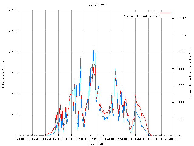 The PML meteorological station, situated on the south-west corner of the building roof, consists of a Hygroclip S3 temperature and humidity sensor housed in a radiation shield, a Mierij Meteo solid state wind sensor (MMW-005), a Chelsea instruments half-hemisphere PAR sensor, a Li-Cor pyranometer (LI-200SZ) and an Omni Instruments 6" tipping bucket raingauge (RG200). The data are logged every 5 minutes using a Pace Scientific XR5 data logger. The real-time rainfall data is likely in error - the correct values will be displayed after a time lag of approximately 24 hours. The meteorological station is sheltered from winds in the north-east and underestimates winds from this quarter. To use these data please contact Dr Tim Smyth.