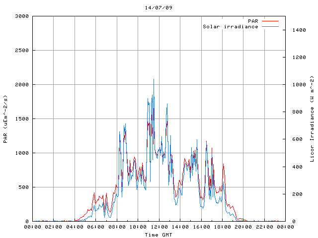 The PML meteorological station, situated on the south-west corner of the building roof, consists of a Hygroclip S3 temperature and humidity sensor housed in a radiation shield, a Mierij Meteo solid state wind sensor (MMW-005), a Chelsea instruments half-hemisphere PAR sensor, a Li-Cor pyranometer (LI-200SZ) and an Omni Instruments 6" tipping bucket raingauge (RG200). The data are logged every 5 minutes using a Pace Scientific XR5 data logger. The real-time rainfall data is likely in error - the correct values will be displayed after a time lag of approximately 24 hours. The meteorological station is sheltered from winds in the north-east and underestimates winds from this quarter. To use these data please contact Dr Tim Smyth.