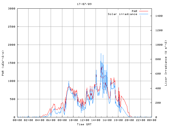 The PML meteorological station, situated on the south-west corner of the building roof, consists of a Hygroclip S3 temperature and humidity sensor housed in a radiation shield, a Mierij Meteo solid state wind sensor (MMW-005), a Chelsea instruments half-hemisphere PAR sensor, a Li-Cor pyranometer (LI-200SZ) and an Omni Instruments 6" tipping bucket raingauge (RG200). The data are logged every 5 minutes using a Pace Scientific XR5 data logger. The real-time rainfall data is likely in error - the correct values will be displayed after a time lag of approximately 24 hours. The meteorological station is sheltered from winds in the north-east and underestimates winds from this quarter. To use these data please contact Dr Tim Smyth.