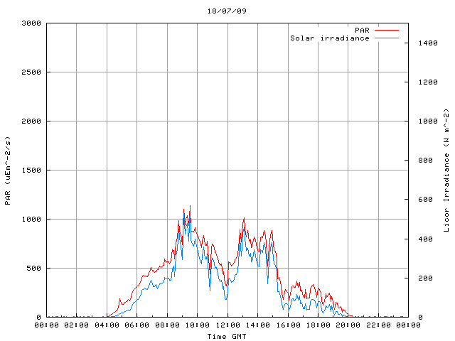 The PML meteorological station, situated on the south-west corner of the building roof, consists of a Hygroclip S3 temperature and humidity sensor housed in a radiation shield, a Mierij Meteo solid state wind sensor (MMW-005), a Chelsea instruments half-hemisphere PAR sensor, a Li-Cor pyranometer (LI-200SZ) and an Omni Instruments 6" tipping bucket raingauge (RG200). The data are logged every 5 minutes using a Pace Scientific XR5 data logger. The real-time rainfall data is likely in error - the correct values will be displayed after a time lag of approximately 24 hours. The meteorological station is sheltered from winds in the north-east and underestimates winds from this quarter. To use these data please contact Dr Tim Smyth.