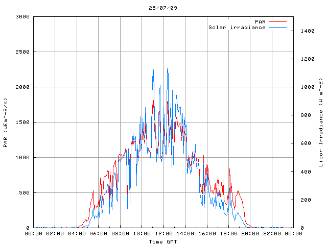 The PML meteorological station, situated on the south-west corner of the building roof, consists of a Hygroclip S3 temperature and humidity sensor housed in a radiation shield, a Mierij Meteo solid state wind sensor (MMW-005), a Chelsea instruments half-hemisphere PAR sensor, a Li-Cor pyranometer (LI-200SZ) and an Omni Instruments 6" tipping bucket raingauge (RG200). The data are logged every 5 minutes using a Pace Scientific XR5 data logger. The real-time rainfall data is likely in error - the correct values will be displayed after a time lag of approximately 24 hours. The meteorological station is sheltered from winds in the north-east and underestimates winds from this quarter. To use these data please contact Dr Tim Smyth.