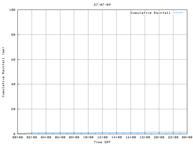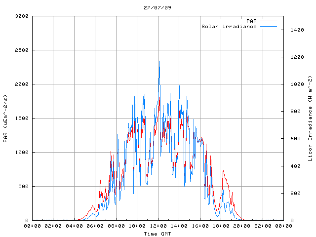 The PML meteorological station, situated on the south-west corner of the building roof, consists of a Hygroclip S3 temperature and humidity sensor housed in a radiation shield, a Mierij Meteo solid state wind sensor (MMW-005), a Chelsea instruments half-hemisphere PAR sensor, a Li-Cor pyranometer (LI-200SZ) and an Omni Instruments 6" tipping bucket raingauge (RG200). The data are logged every 5 minutes using a Pace Scientific XR5 data logger. The real-time rainfall data is likely in error - the correct values will be displayed after a time lag of approximately 24 hours. The meteorological station is sheltered from winds in the north-east and underestimates winds from this quarter. To use these data please contact Dr Tim Smyth.