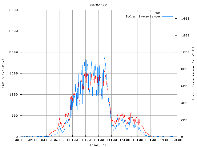 The PML meteorological station, situated on the south-west corner of the building roof, consists of a Hygroclip S3 temperature and humidity sensor housed in a radiation shield, a Mierij Meteo solid state wind sensor (MMW-005), a Chelsea instruments half-hemisphere PAR sensor, a Li-Cor pyranometer (LI-200SZ) and an Omni Instruments 6" tipping bucket raingauge (RG200). The data are logged every 5 minutes using a Pace Scientific XR5 data logger. The real-time rainfall data is likely in error - the correct values will be displayed after a time lag of approximately 24 hours. The meteorological station is sheltered from winds in the north-east and underestimates winds from this quarter. To use these data please contact Dr Tim Smyth.
