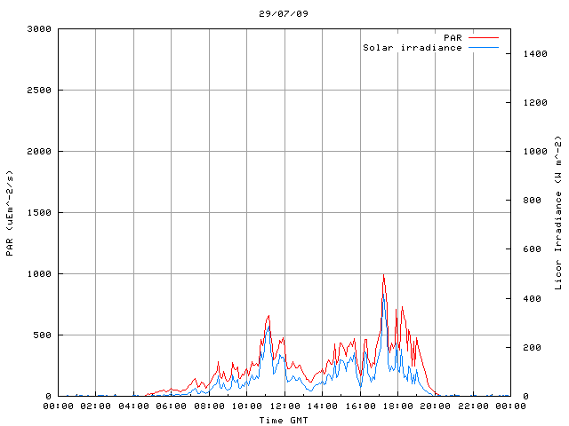 The PML meteorological station, situated on the south-west corner of the building roof, consists of a Hygroclip S3 temperature and humidity sensor housed in a radiation shield, a Mierij Meteo solid state wind sensor (MMW-005), a Chelsea instruments half-hemisphere PAR sensor, a Li-Cor pyranometer (LI-200SZ) and an Omni Instruments 6" tipping bucket raingauge (RG200). The data are logged every 5 minutes using a Pace Scientific XR5 data logger. The real-time rainfall data is likely in error - the correct values will be displayed after a time lag of approximately 24 hours. The meteorological station is sheltered from winds in the north-east and underestimates winds from this quarter. To use these data please contact Dr Tim Smyth.