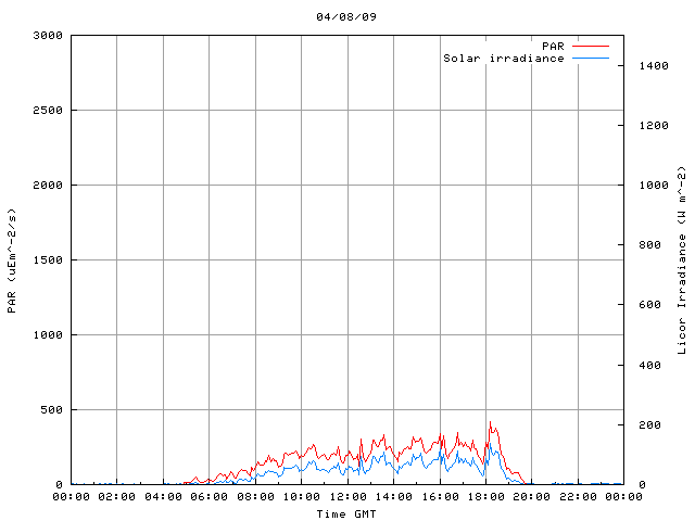 The PML meteorological station, situated on the south-west corner of the building roof, consists of a Hygroclip S3 temperature and humidity sensor housed in a radiation shield, a Mierij Meteo solid state wind sensor (MMW-005), a Chelsea instruments half-hemisphere PAR sensor, a Li-Cor pyranometer (LI-200SZ) and an Omni Instruments 6" tipping bucket raingauge (RG200). The data are logged every 5 minutes using a Pace Scientific XR5 data logger. The real-time rainfall data is likely in error - the correct values will be displayed after a time lag of approximately 24 hours. The meteorological station is sheltered from winds in the north-east and underestimates winds from this quarter. To use these data please contact Dr Tim Smyth.