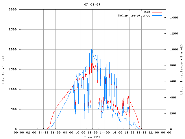 The PML meteorological station, situated on the south-west corner of the building roof, consists of a Hygroclip S3 temperature and humidity sensor housed in a radiation shield, a Mierij Meteo solid state wind sensor (MMW-005), a Chelsea instruments half-hemisphere PAR sensor, a Li-Cor pyranometer (LI-200SZ) and an Omni Instruments 6" tipping bucket raingauge (RG200). The data are logged every 5 minutes using a Pace Scientific XR5 data logger. The real-time rainfall data is likely in error - the correct values will be displayed after a time lag of approximately 24 hours. The meteorological station is sheltered from winds in the north-east and underestimates winds from this quarter. To use these data please contact Dr Tim Smyth.