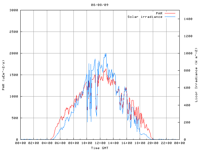 The PML meteorological station, situated on the south-west corner of the building roof, consists of a Hygroclip S3 temperature and humidity sensor housed in a radiation shield, a Mierij Meteo solid state wind sensor (MMW-005), a Chelsea instruments half-hemisphere PAR sensor, a Li-Cor pyranometer (LI-200SZ) and an Omni Instruments 6" tipping bucket raingauge (RG200). The data are logged every 5 minutes using a Pace Scientific XR5 data logger. The real-time rainfall data is likely in error - the correct values will be displayed after a time lag of approximately 24 hours. The meteorological station is sheltered from winds in the north-east and underestimates winds from this quarter. To use these data please contact Dr Tim Smyth.
