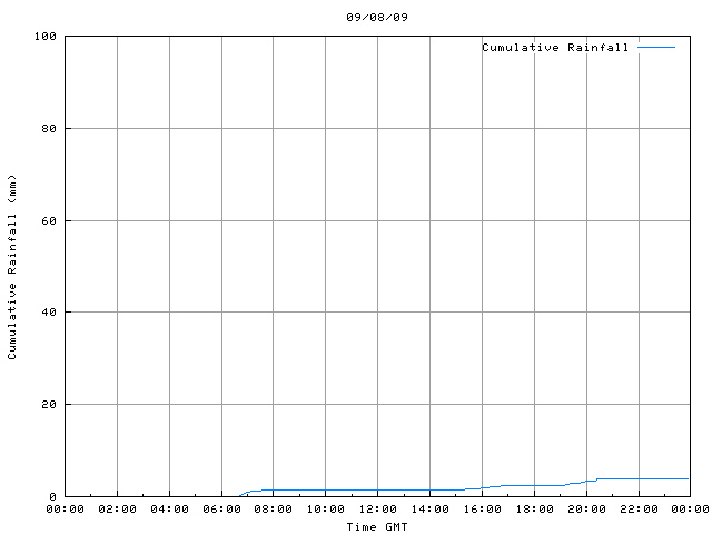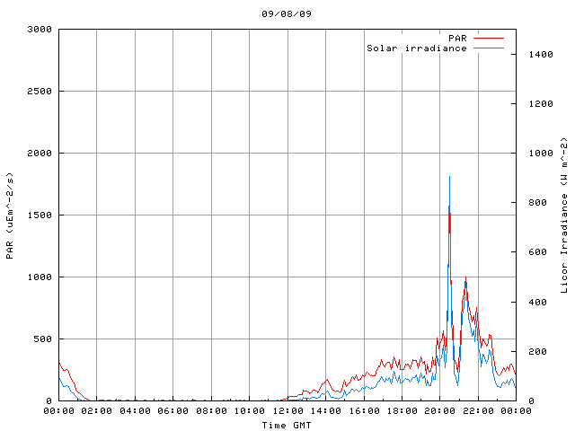 The PML meteorological station, situated on the south-west corner of the building roof, consists of a Hygroclip S3 temperature and humidity sensor housed in a radiation shield, a Mierij Meteo solid state wind sensor (MMW-005), a Chelsea instruments half-hemisphere PAR sensor, a Li-Cor pyranometer (LI-200SZ) and an Omni Instruments 6" tipping bucket raingauge (RG200). The data are logged every 5 minutes using a Pace Scientific XR5 data logger. The real-time rainfall data is likely in error - the correct values will be displayed after a time lag of approximately 24 hours. The meteorological station is sheltered from winds in the north-east and underestimates winds from this quarter. To use these data please contact Dr Tim Smyth.